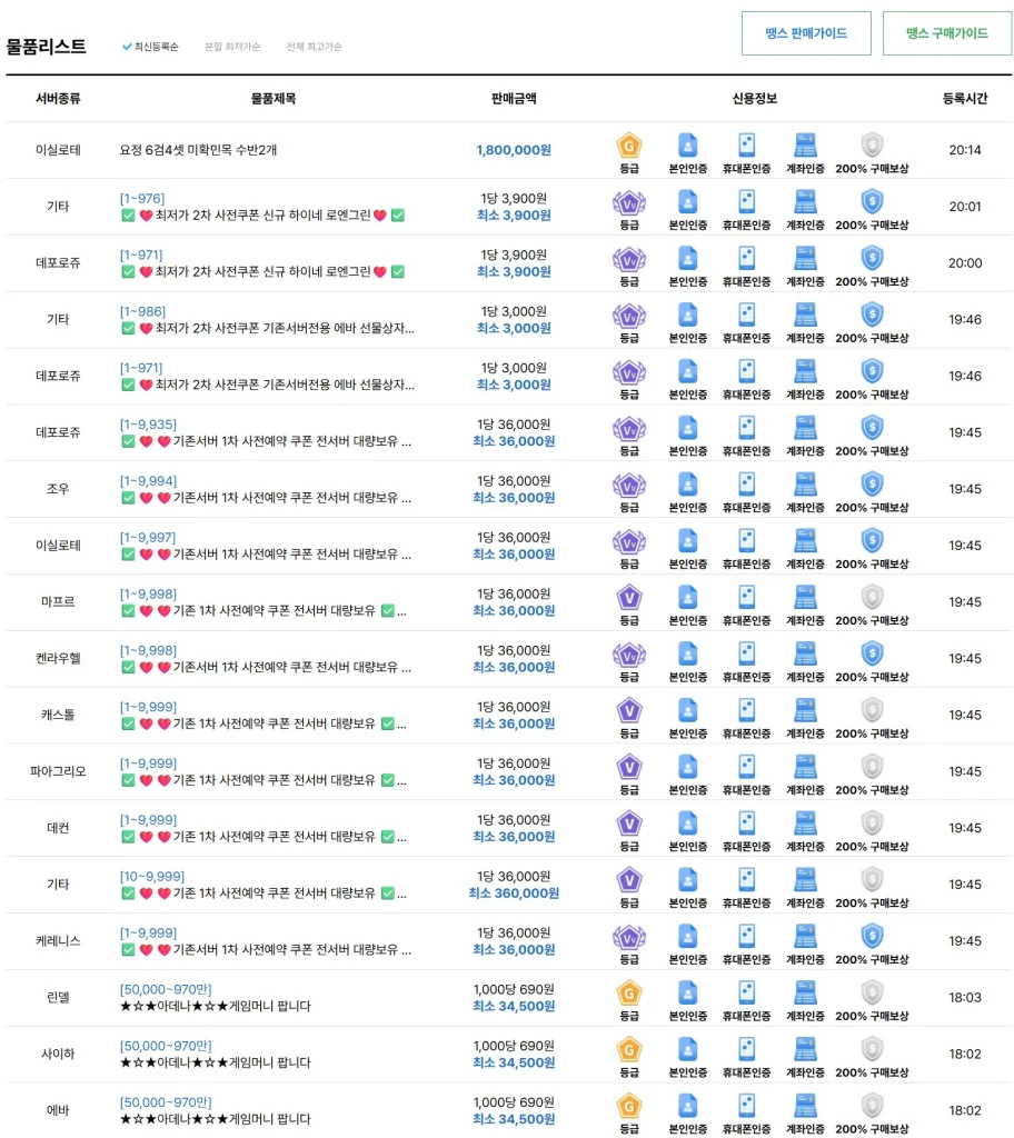 A: 아이템땡스의 전용 대시보드를 통해 실시간으로 확인 가능합니다. 리니지 클래식 페이지와 아이온2 페이지에서는 서버별 매물 현황과 직전 거래가를 투명하게 노출하여, 사용자가 손해 보지 않는 최적의 타이밍에 거래할 수 있도록 돕고 있습니다.